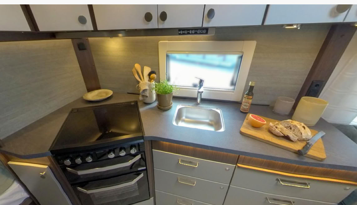 Die Größe 560 ist ideal für zwei Personen, die einen mittelgroßen Wohnwagen mit ausreichend Stauraum und einer großzügigen Küche suchen. Die gemütliche Sitzgruppe kann bei Bedarf jederzeit in ein zusätzliches Bett umgewandelt werden.