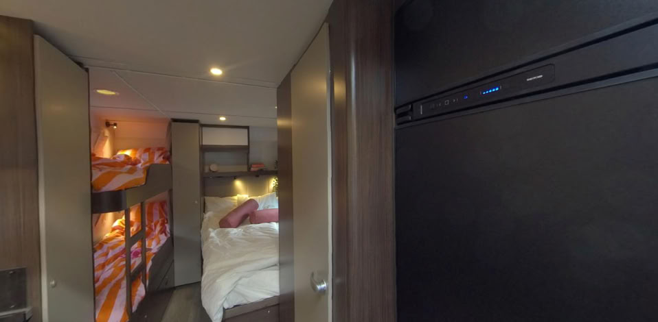 Der Blackline 590 ist ein flexibler Wohnwagen, der sich ganz nach Ihren Bedürfnissen richtet. Seine Größe macht ihn perfekt für Reisen mit vielen Zwischenstopps. Zu zweit genießen Sie einen besonders großzügigen Wohnbereich, während ein alternativer Grundriss Platz für bis zu fünf Personen bietet – ideal für Familien. Besonders beliebt ist die Kinderzimmerlösung mit Etagenbett, das für die Kleinen zu einem gemütlichen Rückzugsort wird.